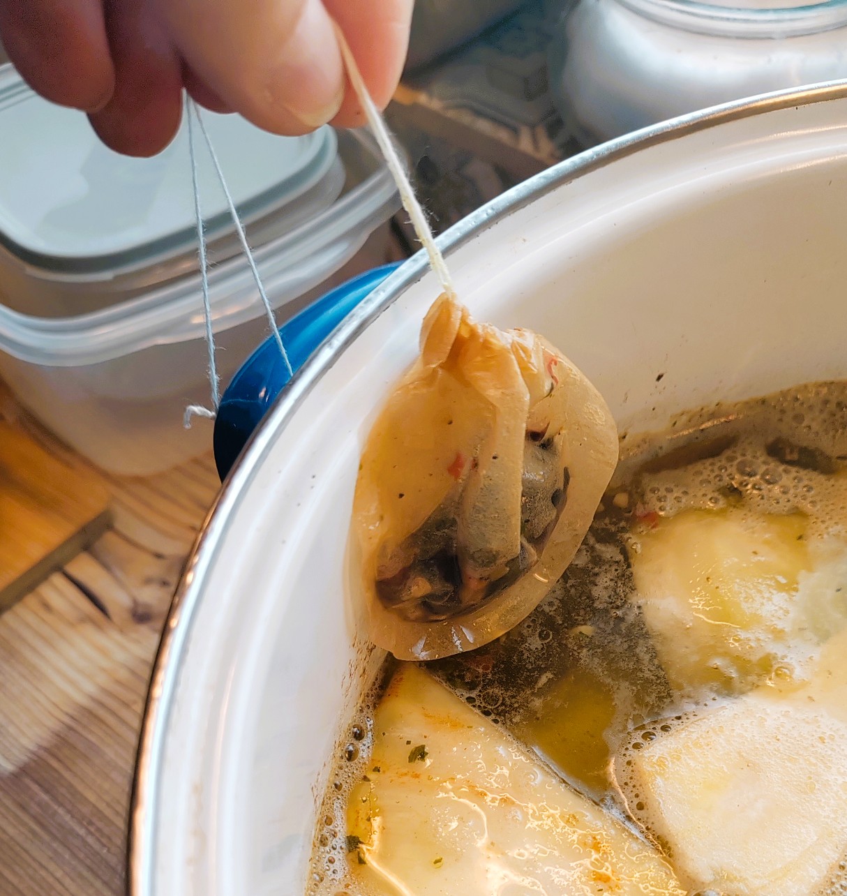 Helyezze a forró vízbe vagy az ételbe. A tasak anyaga bírja a főzést, nem szakad el.